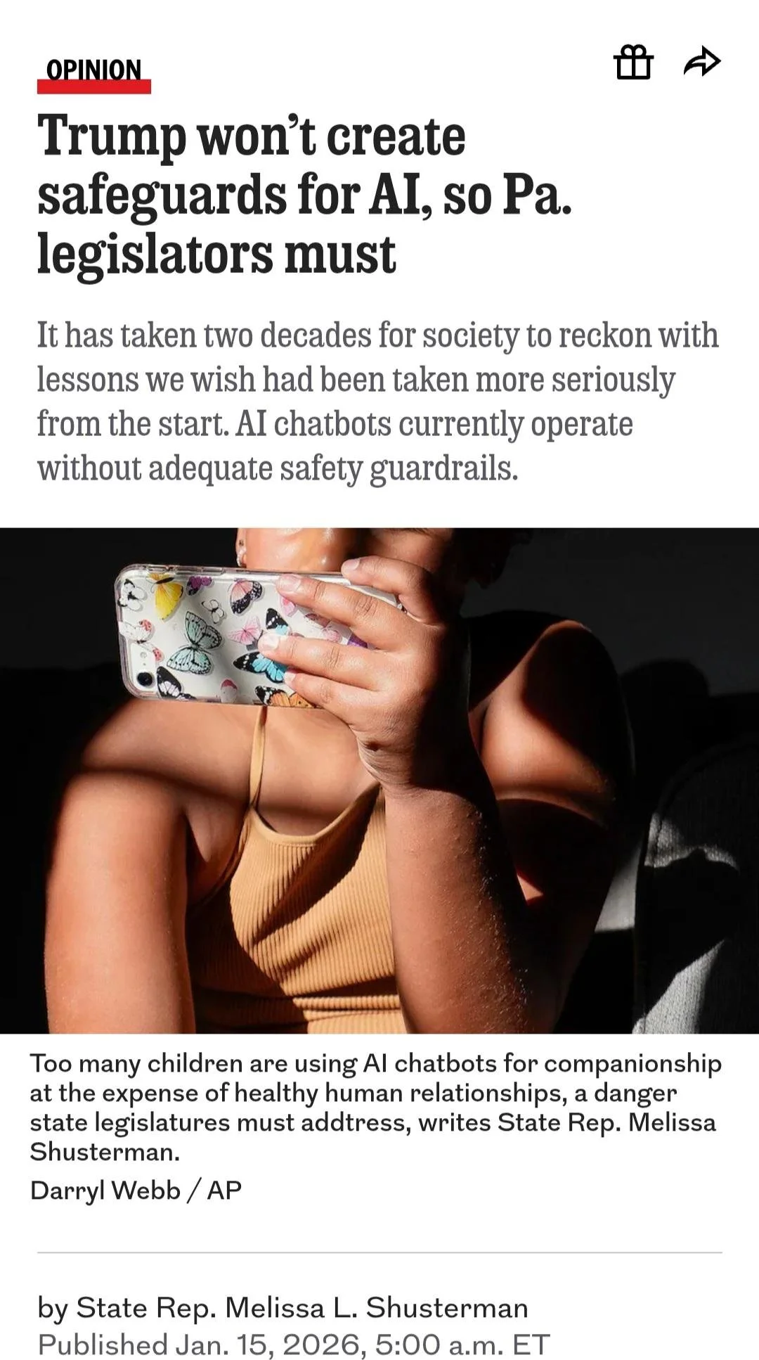 So these officials, Reps. Melissa Shusterman, a Chester County Democrat, and Michael Schlossberg, a Democrat from Lehigh County, are rolling out a proposal to prohibit chatbot platforms from selling or sharing user information and from covert product promotion.